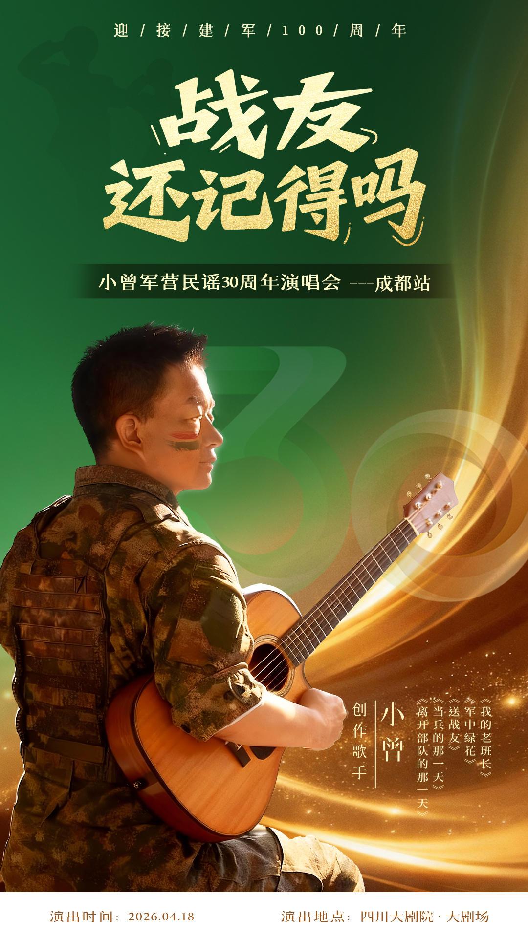 近日,记者获悉,“小曾军营民谣30周年演唱会(成都站)”将于4月18日晚在四川大剧院·大剧场温情开唱。歌手小曾作为军营民谣的开创者,届时将携这30年来的经典金曲,用质朴的旋律唤醒一代人的军旅记忆,重温那段热血与柔情交织的青春过往。据了解,演唱会门票将于2月8日10:00开启预售。西部新闻网联合多家媒体重磅聚焦。