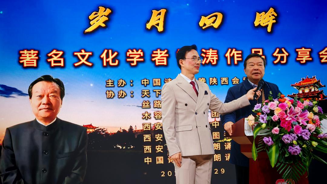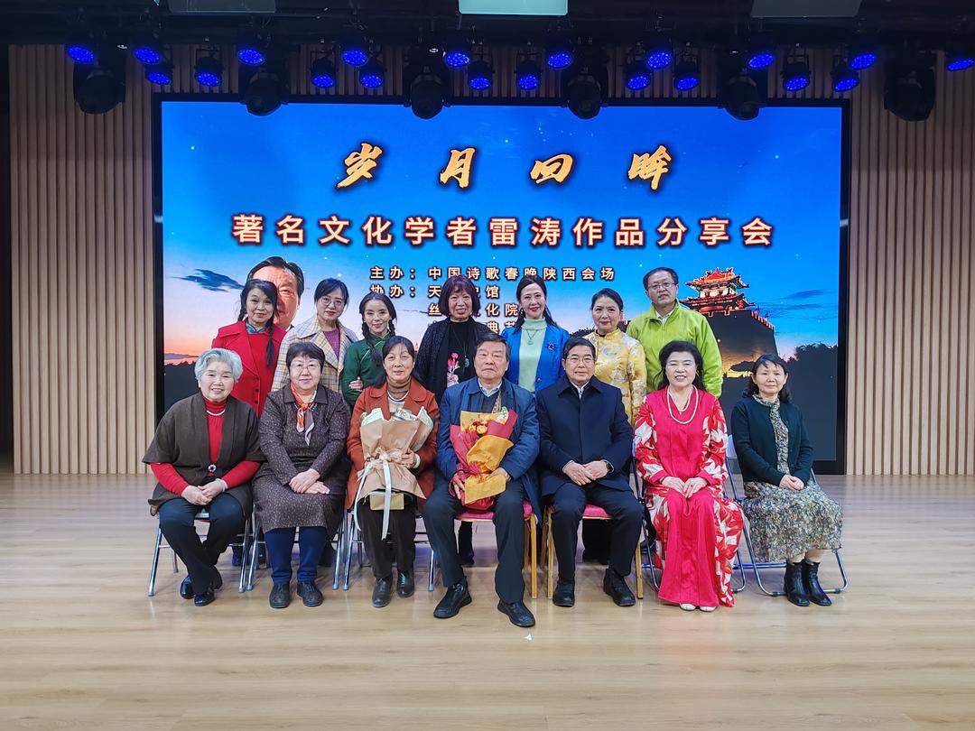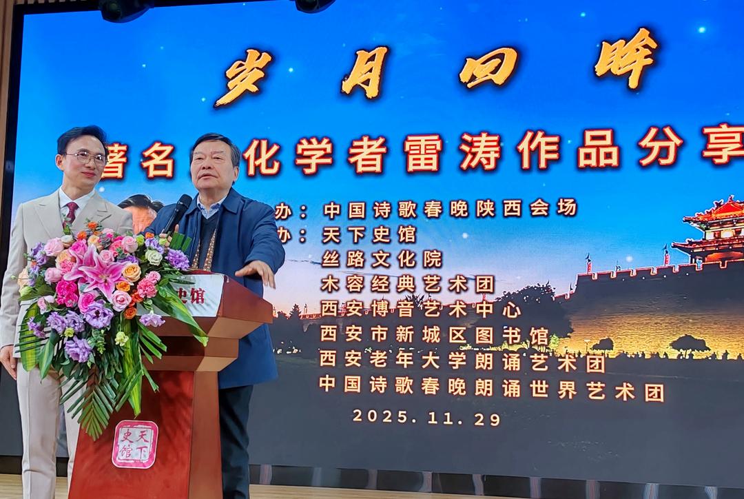 本次分享会由中国诗歌春晚陕西会场主办,天下史馆、丝路文化院、木容经典艺术团、西安博音艺术中心、西安老年大学朗诵艺术团、中国诗歌春晚朗诵世界艺术团、西安市新城区图书馆等多家机构联合协办,是一场集文学交流、艺术演绎于一体的文化盛事。活动伊始,全场目光聚焦于特邀嘉宾——雷涛先生。作为著名文化学者、作家、书法家,他曾任陕西省作家协会党组书记、常务副主席,陕西省政协常委、文教委主任,更是首届“契诃夫文学奖”获得者。数十年间,雷涛先生笔耕不辍,博览群书,深耕经史文哲、音乐书法等多个领域,著有10多部文学著作,其作品扎根乡土、情感真挚,兼具思想深度与艺术感染力。