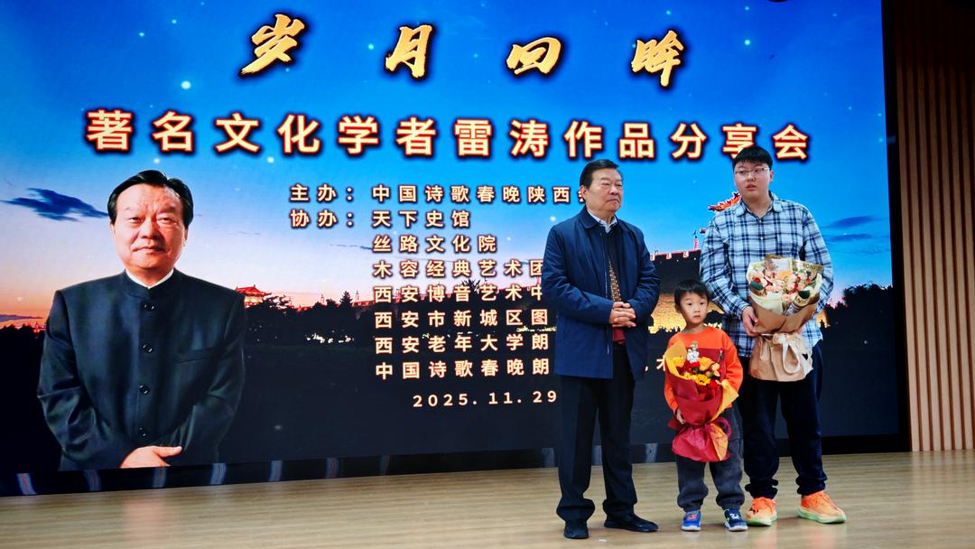 初冬的长安,寒意渐浓,幸福剧场内却因一场文化盛宴暖意融融。11月29日下午3时,“岁月回眸”著名文化学者雷涛作品《原乡记忆》分享会在此盛大举行,文化界贤达、艺术界名家、朗诵爱好者齐聚一堂,以声音为翼,以情感为桥,共同穿越岁月长河,走进著名文化学者雷涛先生的文学世界,感受原乡记忆里的家国情怀与人文温度。西部新闻网联合多家媒体重磅聚焦本次活动。